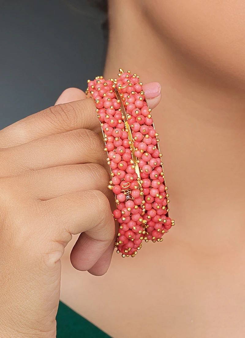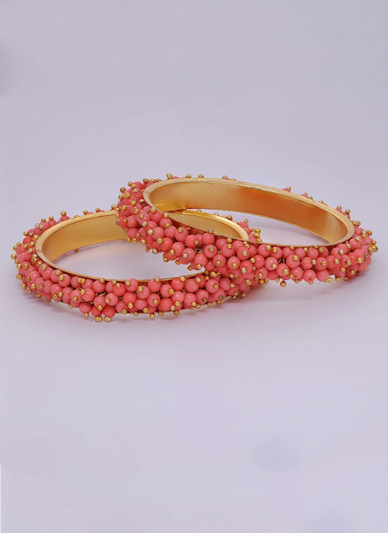 The bangles feature a stunning combination of golden and baby pink beads meticulously arranged in a delicate pattern. Each bead is carefully selected to ensure uniformity in size and shape creating a harmonious visual appeal. The golden beads exude a rich luxurious aura while the baby pink beads add a touch of femininity and grace making these bangles a perfect choice for both traditional and contemporary outfits.