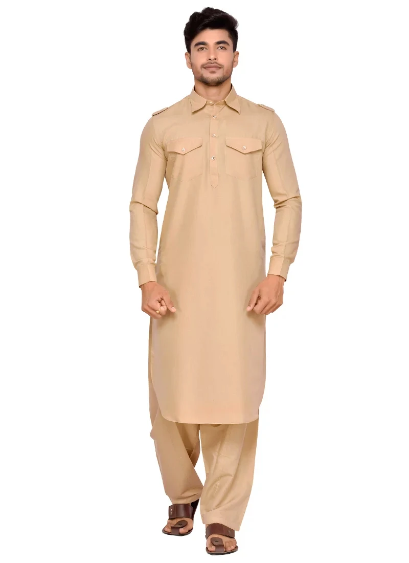Beige art silk plain structred pathani set with side square pockets on it. Comes with matching bottom.