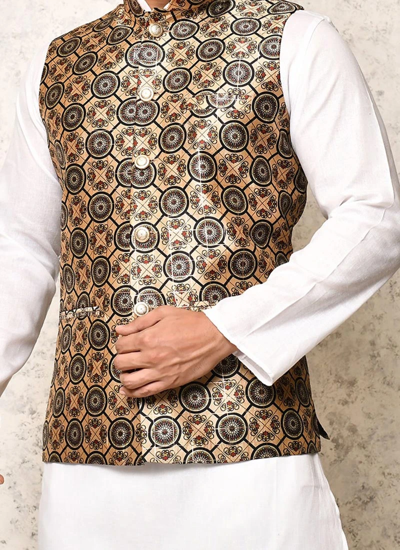 Shine brighter as you wear this pretty beige art silk nehru jacket crafted with mandarin collar neck and sleeveless enriched with printed work is representing royalty in itself.