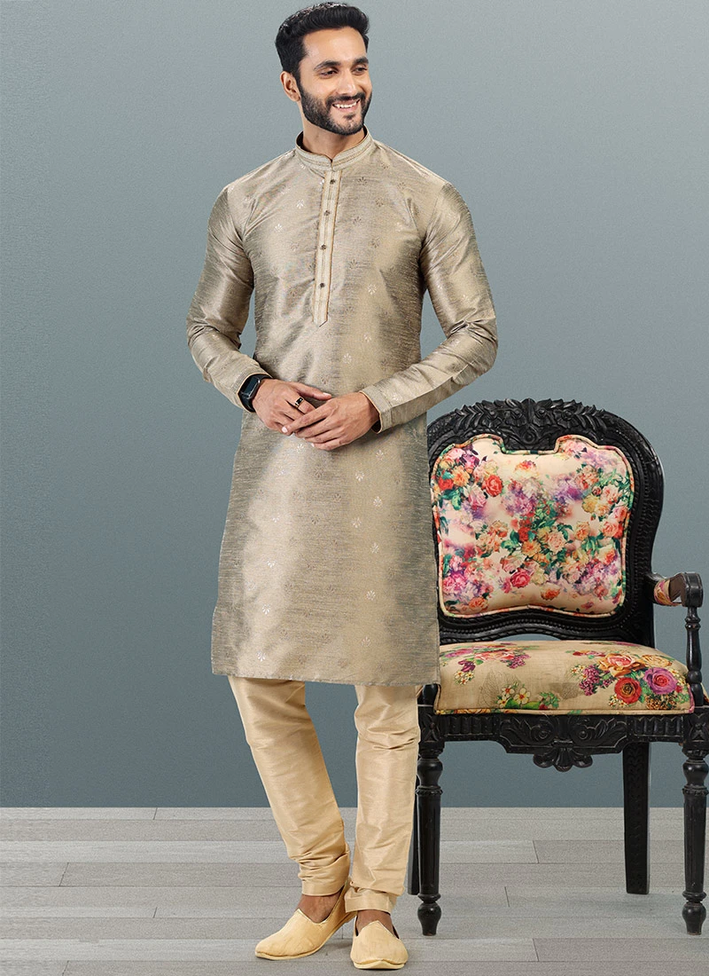 Style and trend will be at the peak of your beauty when you attire this beige banarasi silk kurta pyjama enriched with jacquard work over the kurta and crafted with full sleeves and mandarin collar neckstyle is representing a royalty in itself. This Kurta pyjama comes with beige art banarasi silk chudi bottom.