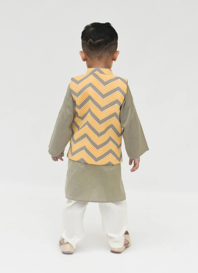 Make your boy stunning in this beige cotton silk boys bandi set crafted with full sleeves and collar neckstyle looks chic and ideal for any affair. This set comes with off white cotton silk straight pant pant bottom and yellow n grey cotton silk jacket with printed work.