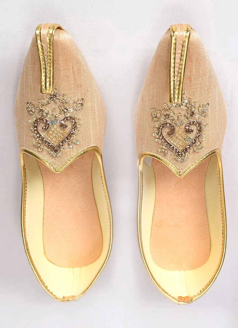 Beige color raw silk mojris embellished with hand work and closed toe detailing.