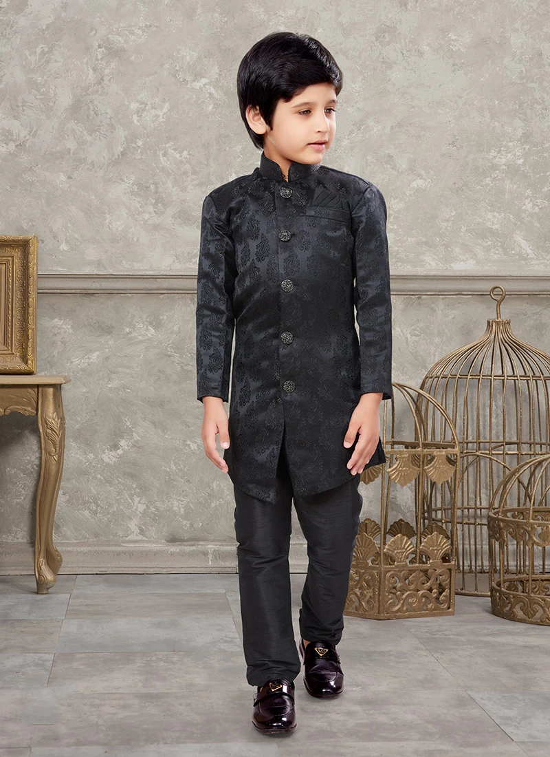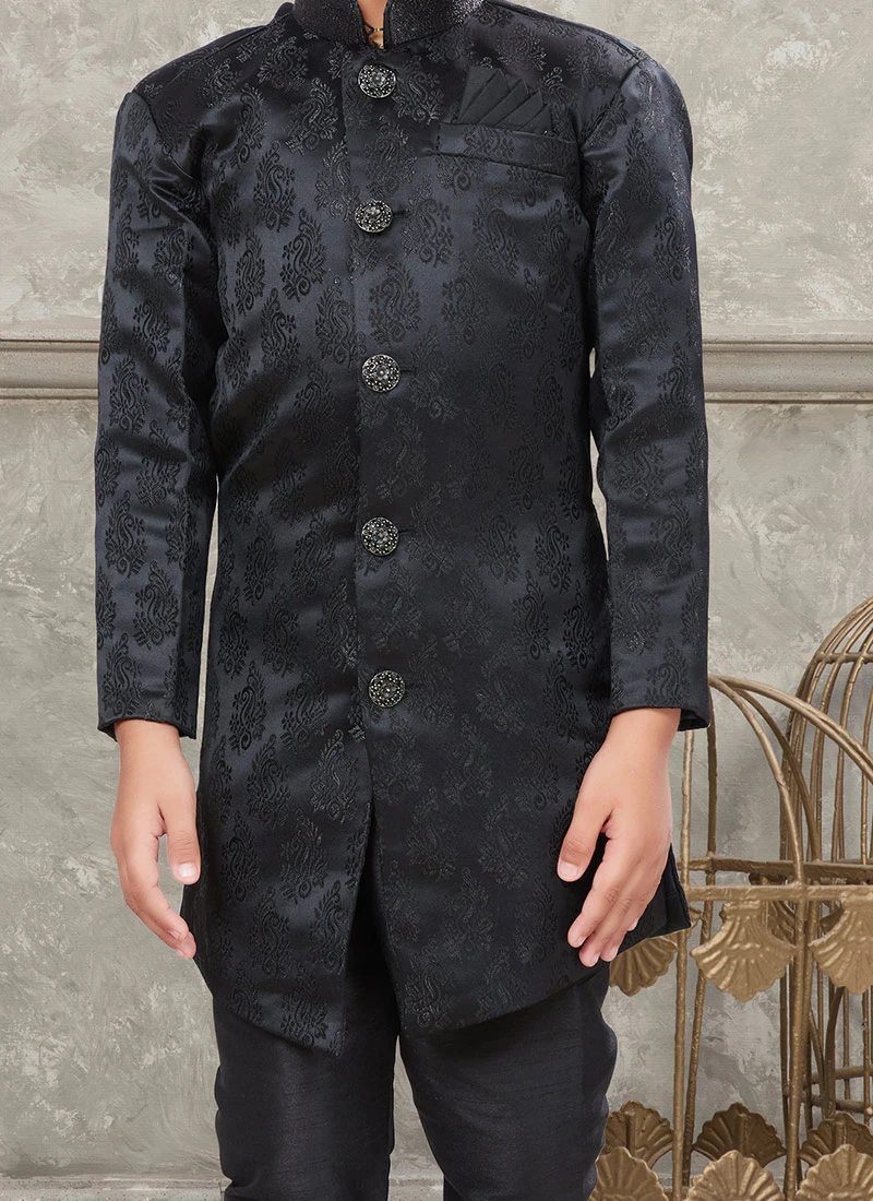 In summary the Black Art Silk Jacquard Indowestern Sherwani is a masterfully crafted garment that embodies the essence of traditional Indian attire while incorporating modern design elements. Its opulent black colour intricate jacquard weave and exquisite embroidery make it a timeless and captivating choice for those seeking to make a lasting impression at special gatherings. This sherwani is a celebration of heritage and style blending the best of both worlds for a truly distinguished look.