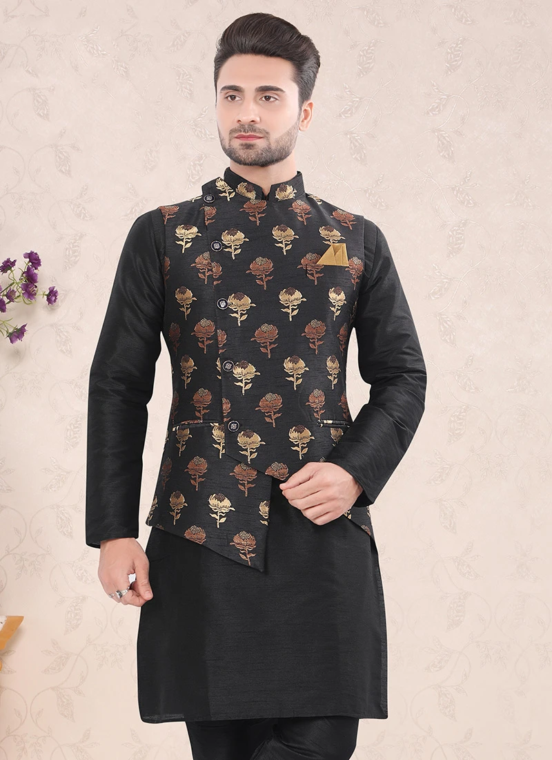 Create a smoldering impact by this black benarasi brocade nehru jacket crafted with mandarin collar neck and sleeveless enriched with brocade printed work is representing royalty in itself.