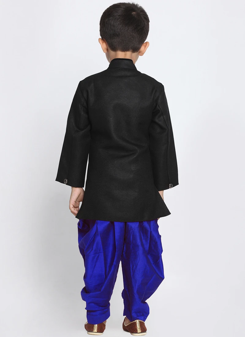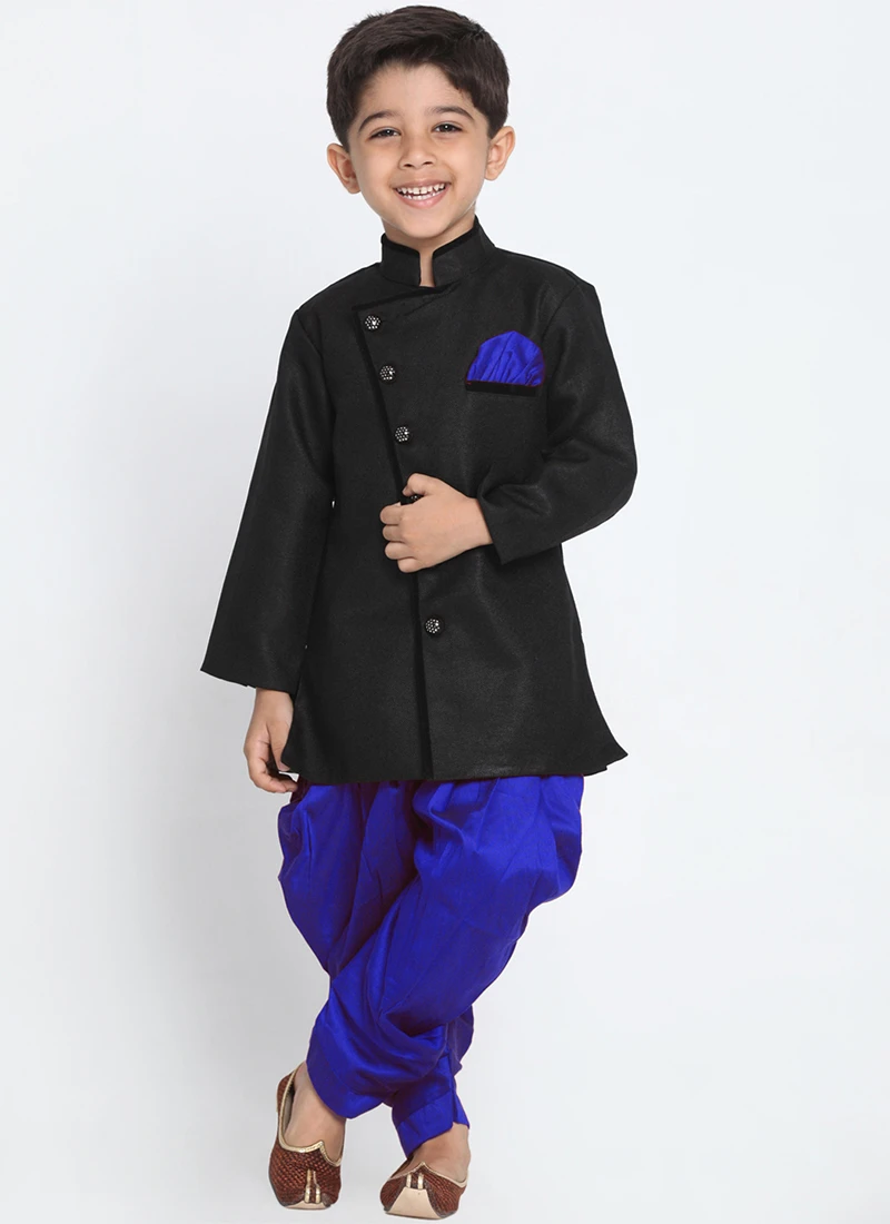 Your child look Pretty in this black dupion silk indowestern sherwani. The plain work appears to be like chic and best for festival. Comes with dupion silk bottom.