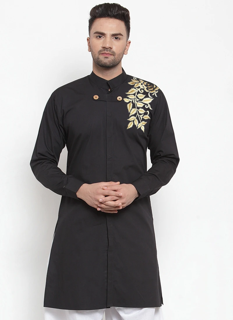 Be your own style icon in this black cotton indowestern kurta enriched with embroidered work and crafted with full sleeves and collar neckstyle is representing a royalty in itself.