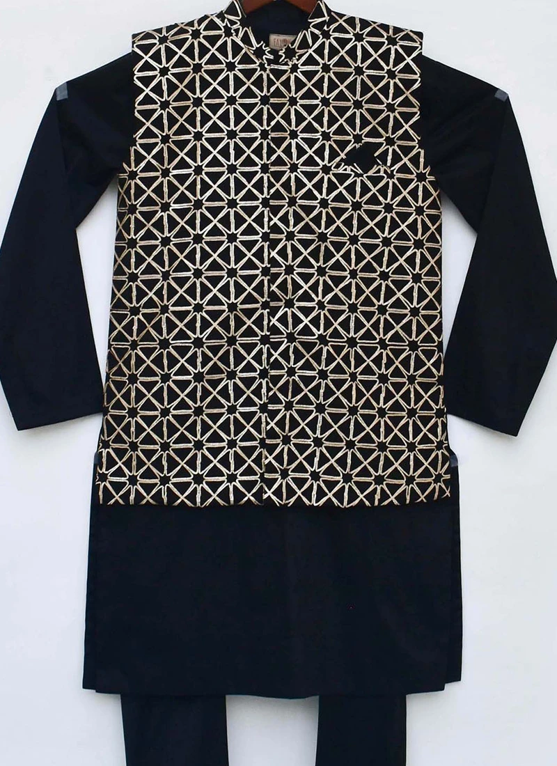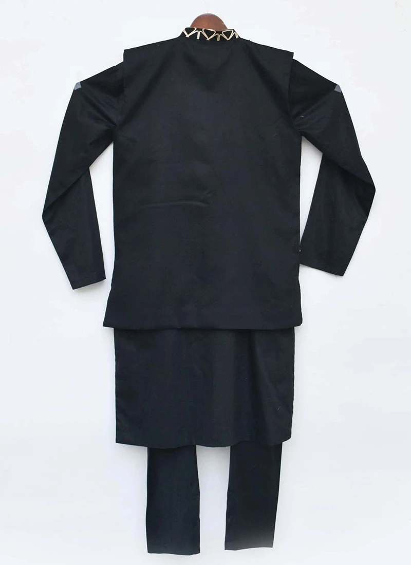 Looking amazing with attachment of black cotton silk boys bandi set will make you stylish with soild plain work crafted with full sleeves and mandiran collar neckstyle looks chic. This set comes with black cotton silk pant bottom and black cotton silk embroidered jacket.