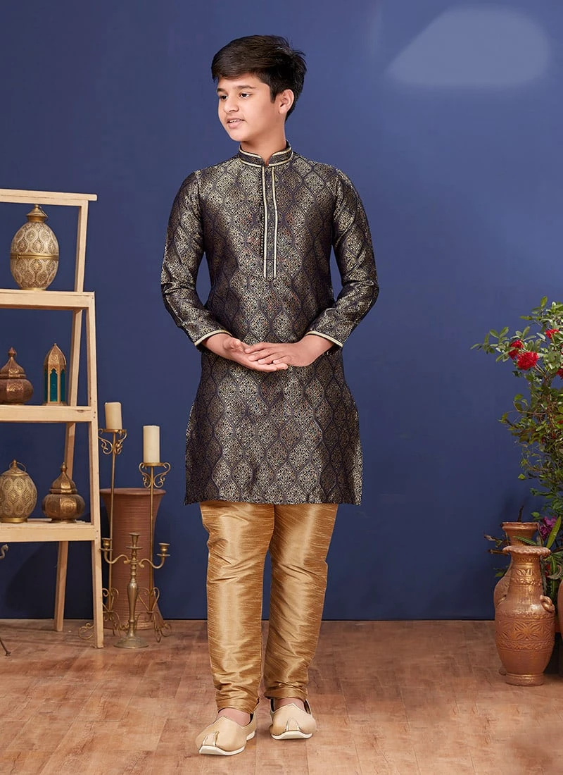 Be your own style icon with black jacquard silk kids boys kurta pyjama crafted with close collar neck and full sleeves. The lovely jacquard work a substantial feature of this attire. This kurta Pyjama comes with gold dupion silk chudi style pant bottom.