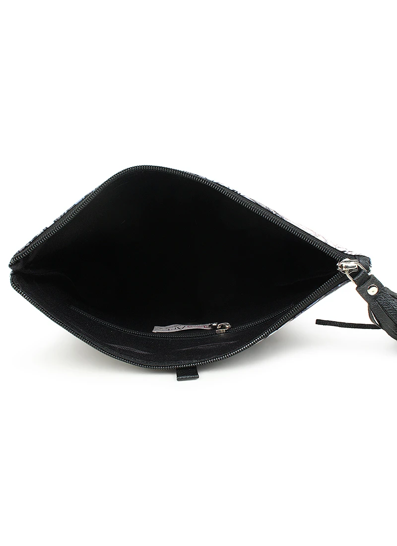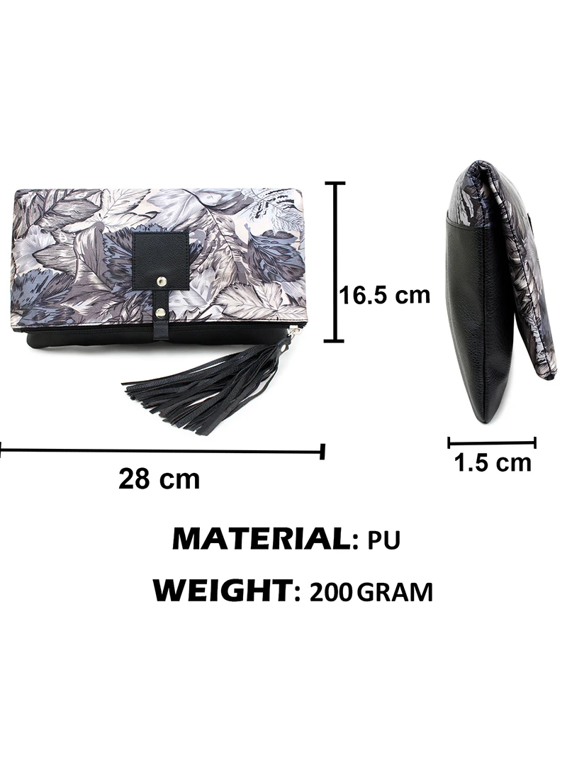 Black N Grey polyster clutch with some decorative designs on the clutch and comes with zipper closure.