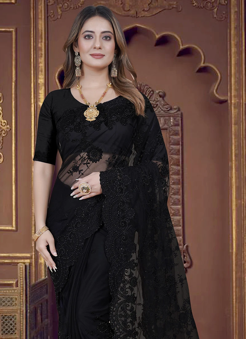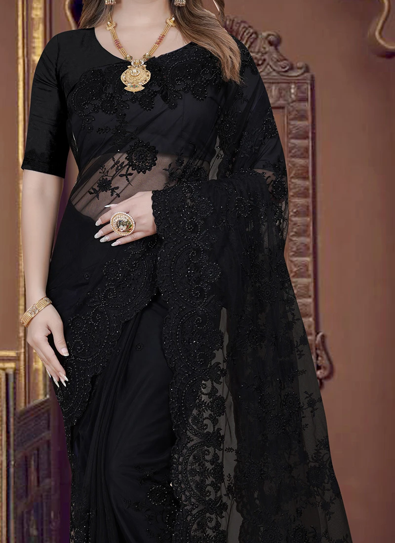In the world of fashion certain garments possess a timeless allure that transcends trends and generations. The Black Net Embroidered Sari is one such masterpiece that embodies the essence of sophistication grace and unadulterated beauty. Crafted with precision and adorned with intricate details this sari is a symbol of opulence and tradition making it a musthave for any discerning fashion connoisseur.