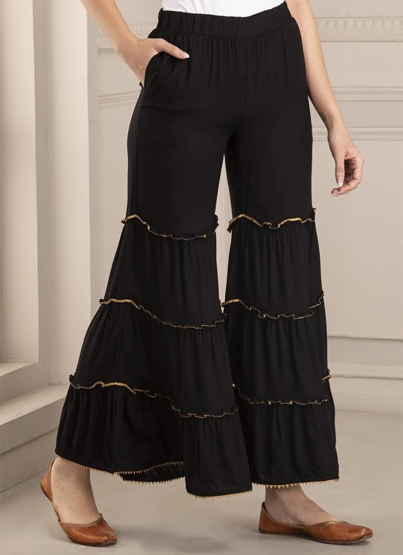 True beauty will come out of your dressing style and design with this black rayon sharara pant. The beautiful bottom looks a vital attribute of this attire.
