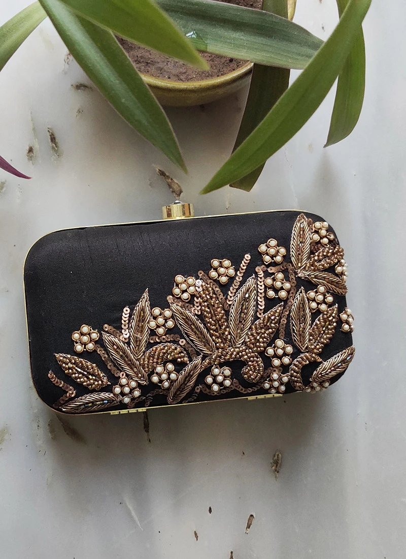 This pretty black silk designer clutch enriched hand embroidered with zardosi and pearl work on one side with long sling chain.