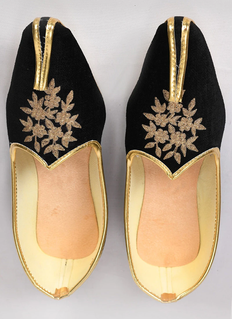 Black color silk mojris embellished with hand work and chic for partywear.