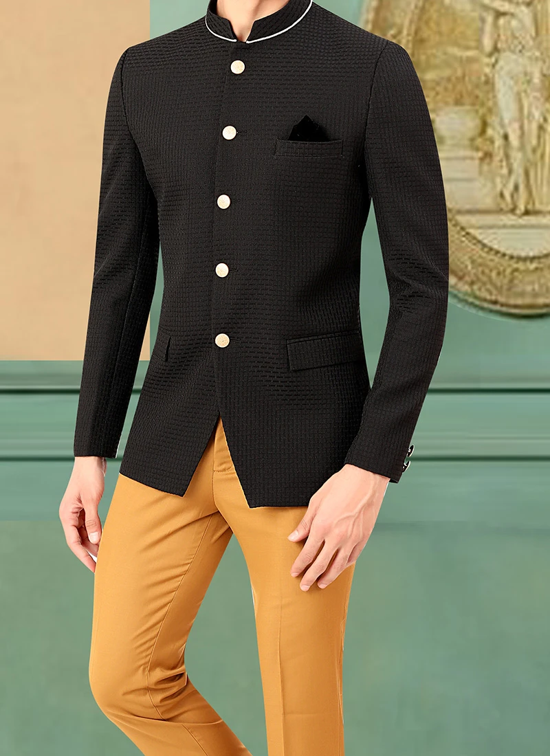 Be the centre of attention in this black color terry rayon bandhgala suit. This suit comes with some designs and crafted with collar neck and full sleeves looks desirable. This suit comes with beige terry rayon pant bottom.