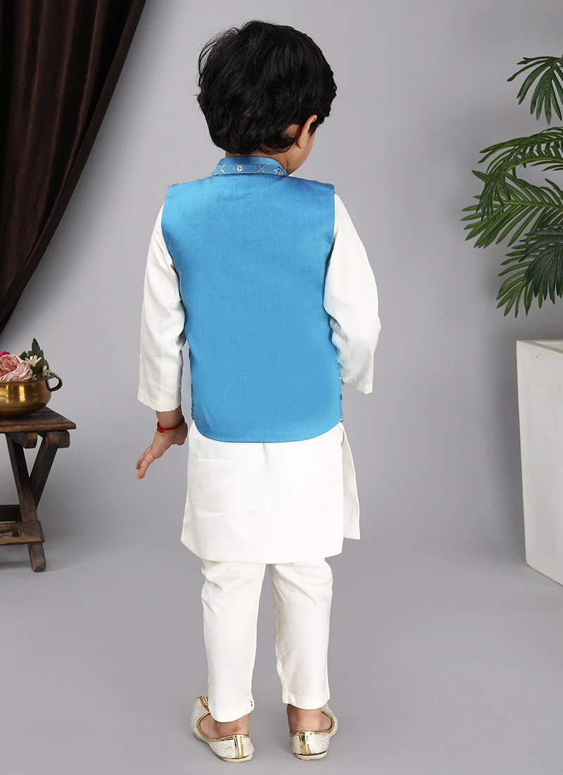 Look stylish in this off white cotton boys bandiset will make you stylish and graceful. It plain work crafted with full sleeves and collar neckstyle looks chic and ideal for any affair. This set comes with off white cotton chudi bottom and with blue color art silk with sequins work nehru jacket.
