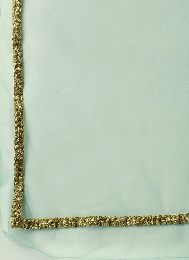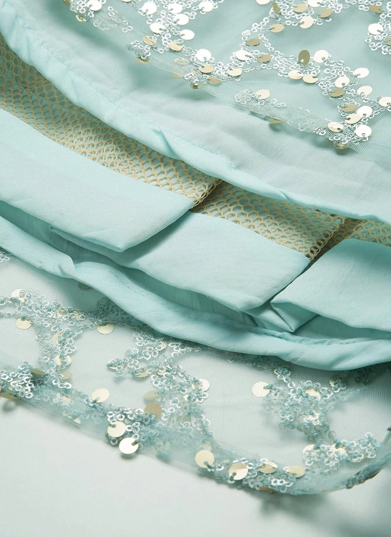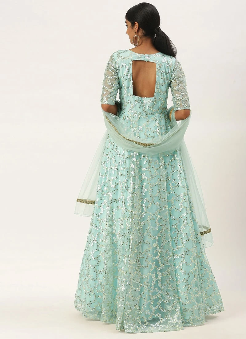 Presenting a blue embroidered floor length bridal gown, it has close neckline at front and high neckline with keyhole at back, yoke length till natural waist, elbow sleeve, opening with side zipper, full circular flare till floor length, it has embellished detectable belt on waist. The gown paired up with blue net dupatta with embellished border and ruffles added on hemline. Mask only for shoot purposes.Refer the fabric image for true color of the dress. This dress is custom designed from fabric and custom stitched. Once sold cannot be returned.Designs, colors, and patterns on the actual product may slightly vary from designs shown in the image. Images are the only representative