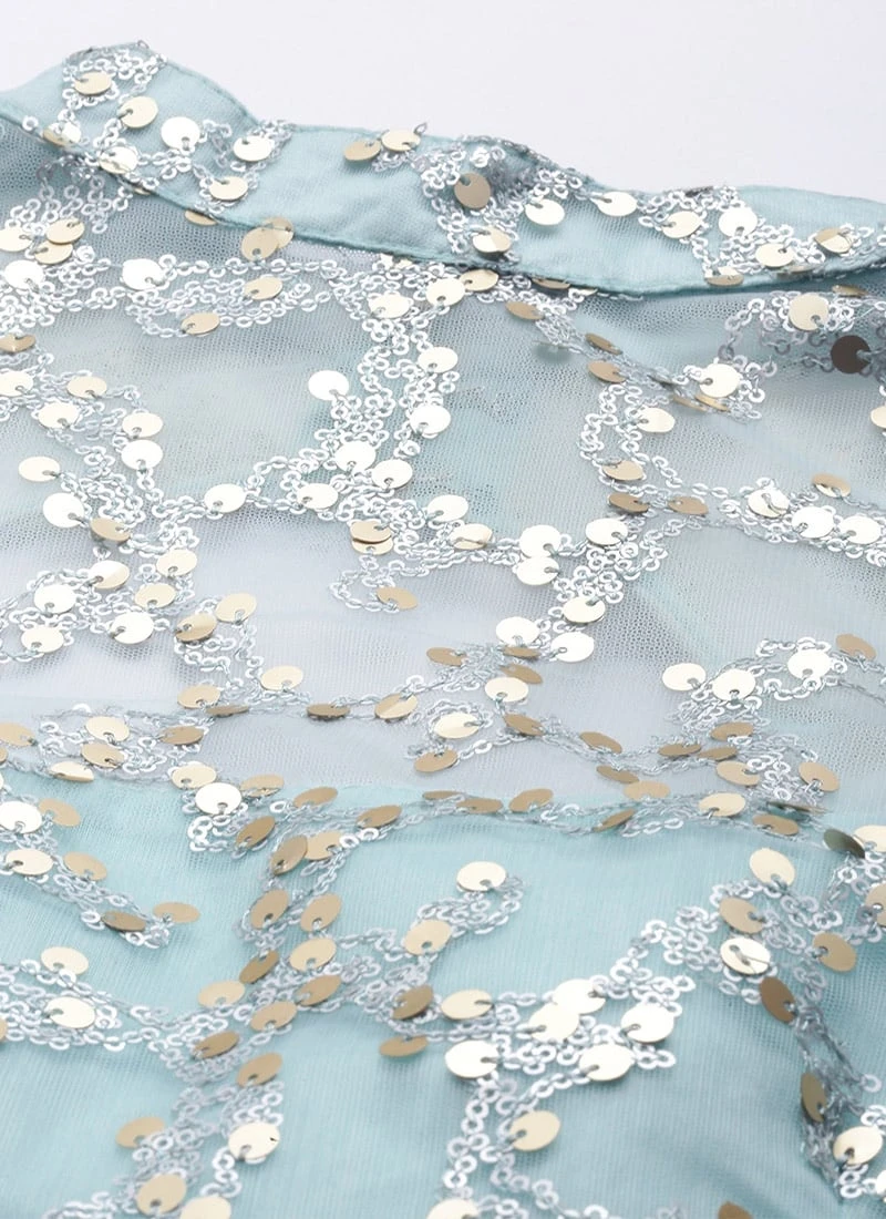 Presenting a blue net embroidered gown, features collar neckline both in front and in the back, the front has keyhole detailing along with a loop and potli ball opening on the collar, sheer full sleeves, yoke until natural waist, embroidered full circular flare until knee length, followed by two layers of plain mint green net gathered flare from knee to calf and calf to floor-length with beige gold borders at the hemline. The gown has side zip closure. Cancan is preferred for voluminous flare. Mask only for shoot purposes.Refer the fabric image for true color of the dress. This dress is custom designed from fabric and custom stitched. Once sold cannot be returned.Designs, colors, and patterns on the actual product may slightly vary from designs shown in the image. Images are the only representative