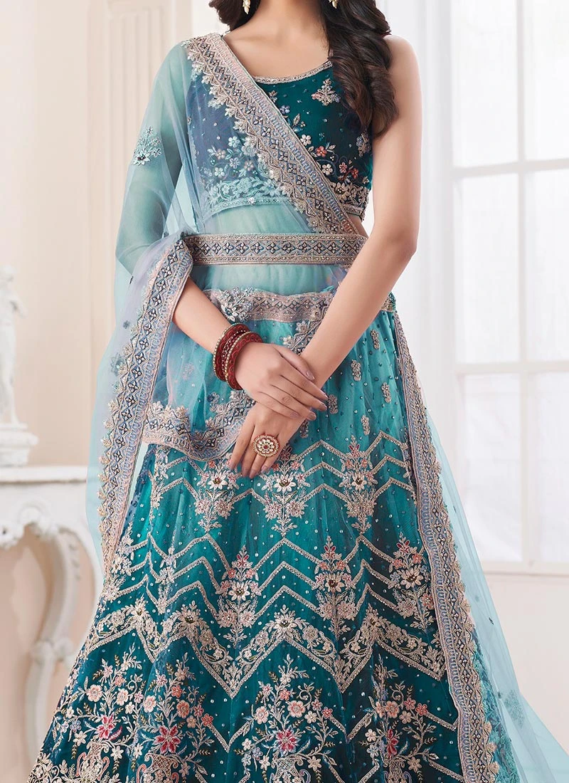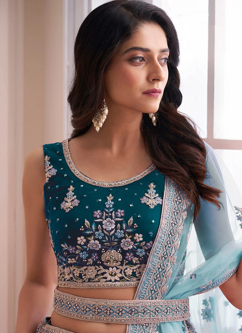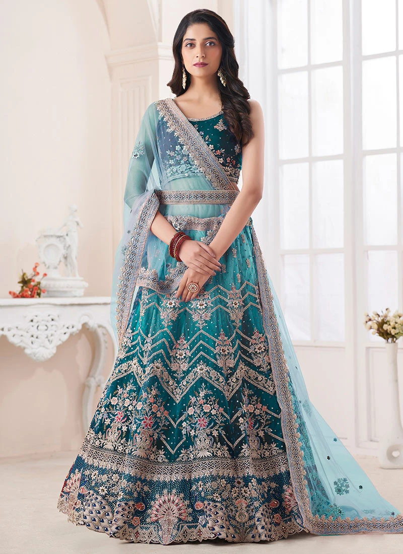 Comes with semi -stitched lehenga, un stitched choli and dupatta fabric. To have it stitched, please select the custom tailoring options. Lehenga with elaborate patterns and colors are used for photo-shoot. Color and pattern of the lehenga might not be as shown in the image.