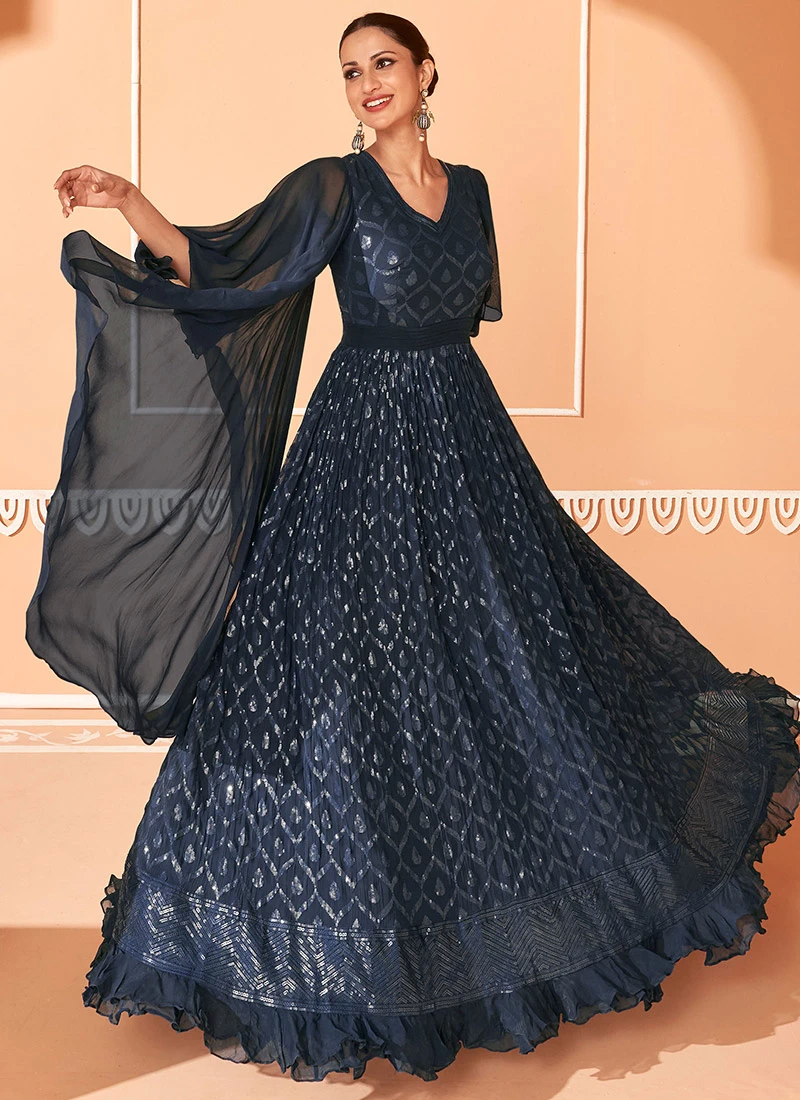 Envelop yourself in the ethereal allure of Blue Faux Georgette Sequins Dresses and Gowns where timeless elegance meets contemporary glamour. Crafted from luxurious faux georgette fabric these dresses and gowns redefine sophistication. The soft lightweight material drapes gracefully enhancing your silhouette and providing unparalleled comfort.