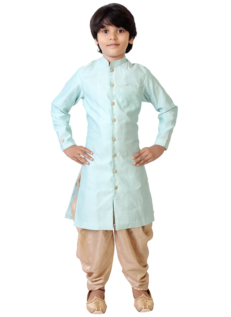 Presenting Blue art silk sherwani with beige dhoti pants, features Chinese collar, full sleeves, comes with front opening, below knee-length sherwani, slit on both the side start from hip level,shoulder-pad added, paired up with beige dhoti pant with the drawstring closure. Mask only for shoot purposes.Refer the fabric image for true color of the dress. This dress is custom designed from fabric and custom stitched. Once sold cannot be returned.Designs, colors, and patterns on the actual product may slightly vary from designs shown in the image. Images are the only representative