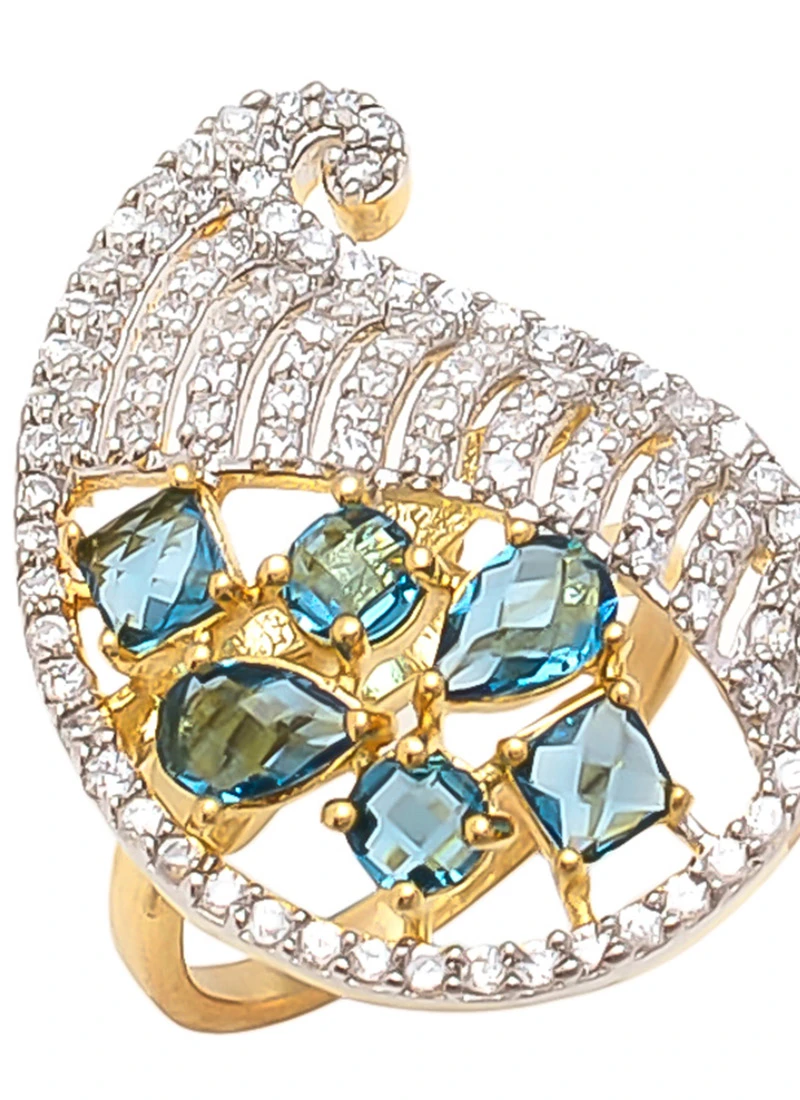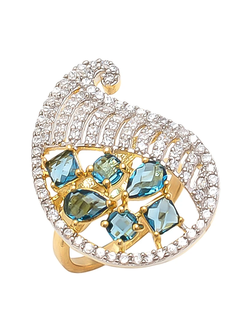 The designer golden plated ring with decorative blue and white stones studded on the ring.