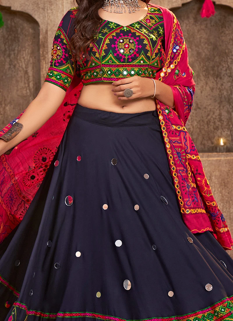 Comes with semi -stitched lehenga, un stitched choli and dupatta fabric. To have it stitched, please select the custom tailoring options. Lehenga with elaborate patterns and colors are used for photo-shoot. Color and pattern of the lehenga might not be as shown in the image.