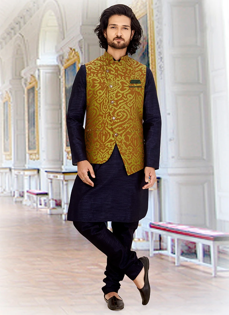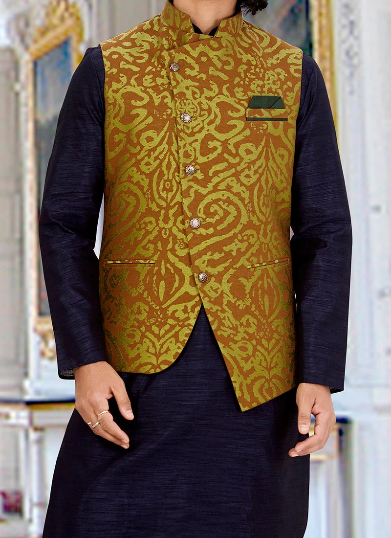 Brown and green art silk bandhgala jacket with jacquard abstract patterns on the jacket.