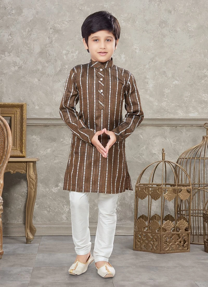 In conclusion the Coffee Art Silk Kids Boys Kurta Pyjama is a tasteful and versatile choice for young boys offering a blend of comfort and style. It allows them to embrace their cultural heritage while looking smart and sophisticated on special occasions. Crafted from premium art silk this outfit is a testament to quality and craftsmanship ensuring that your child stands out in elegance and charm.