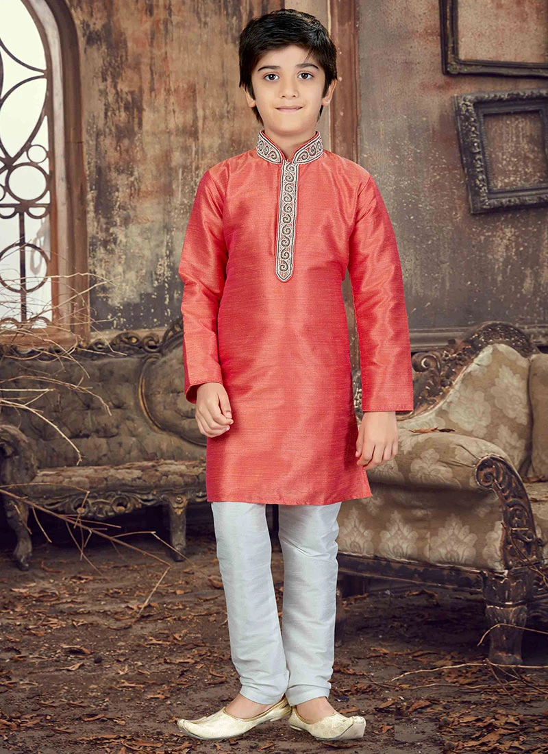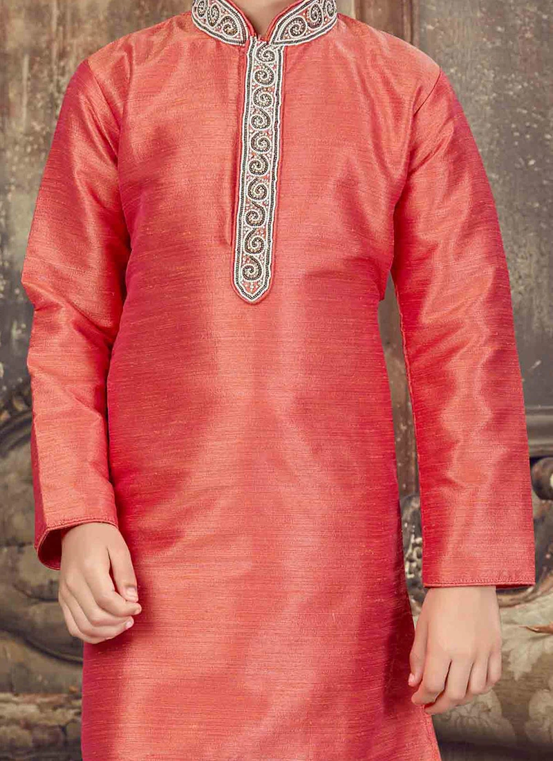Coral pink art silk kids kurta pyjama set with stone works enhancing the embroidered foliage patterns on the yoke. Comes with matching bottom.