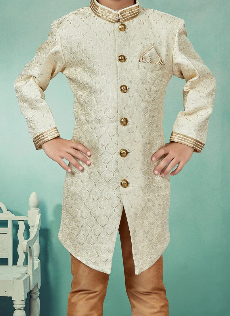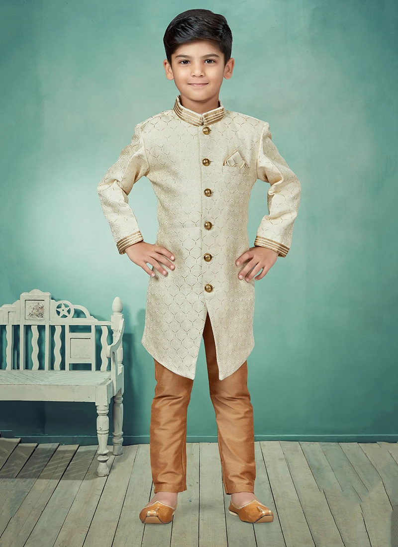 Look amazing with the attachment of cream art silk boys indowestern sherwani enriched with jacquard work over the sherwani crafted with full sleeves and mandarin collar neckstyle is representing a royalty in itself. This sherwani comes with chikoo silk dupion chudi pant bottom.pion chudi pant bottom.