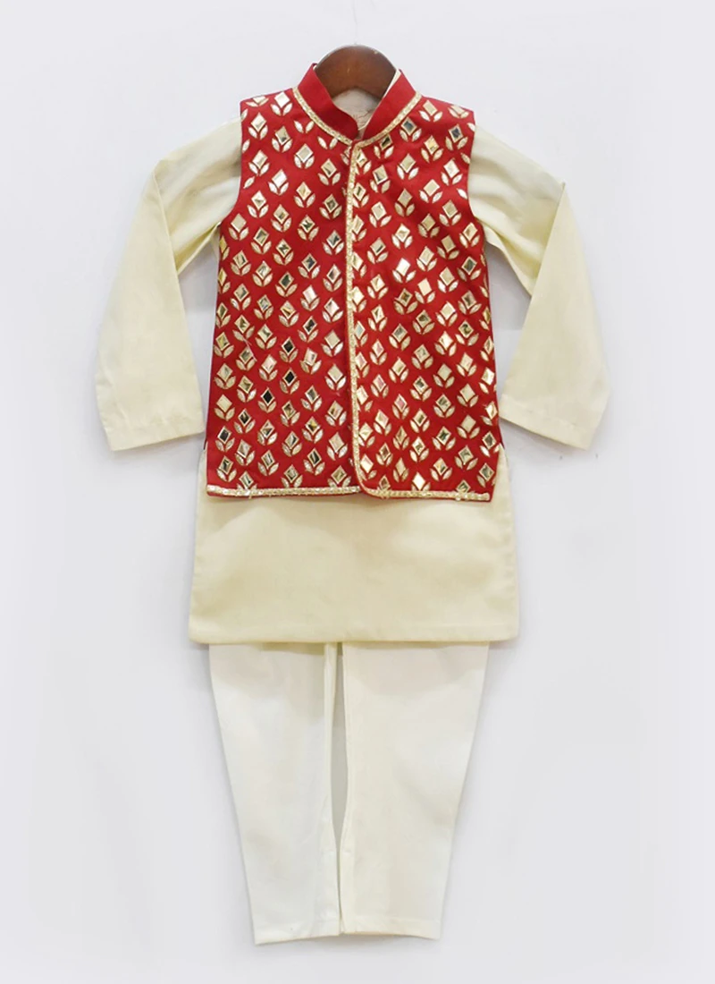 Make your boy stunning in this cream cotton silk boys bandi set will make you stylish and graceful. It crafted with full sleeves and mandiran collar neckstyle looks chic and ideal for any affair. This set comes with off white cotton silk straight pant bottom and with dark red cotton silk with mirror embroidered work.
