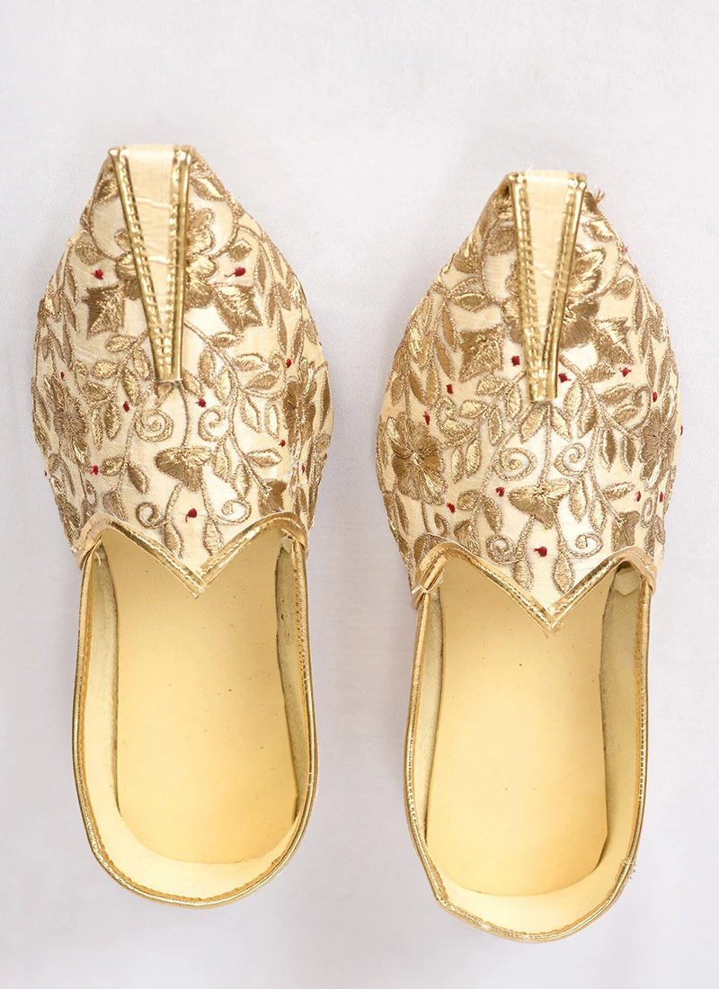 Cream raw silk mojris embellished with embroidery work and looks pretty.