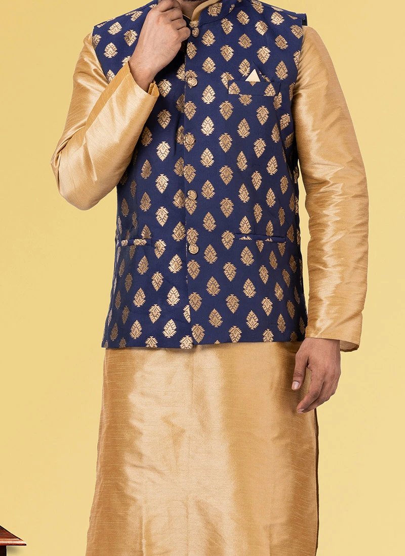 You will be confident to make a impressive fashion statement with this dark blue jacquard silk nehru jacket crafted with mandarin collar neck and sleeveless enriched with jacquard work is representing royalty in itself.