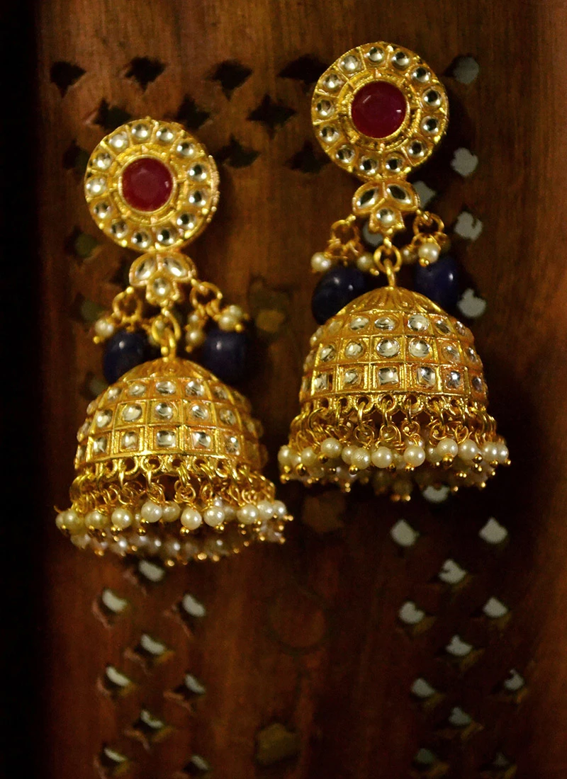 Look pretty in this designer golden plated necklace set comes with kundan studded on it and dark blue beads stringed and dangling on the necklace with decorative designs looks pretty. Comes with matching earrings.