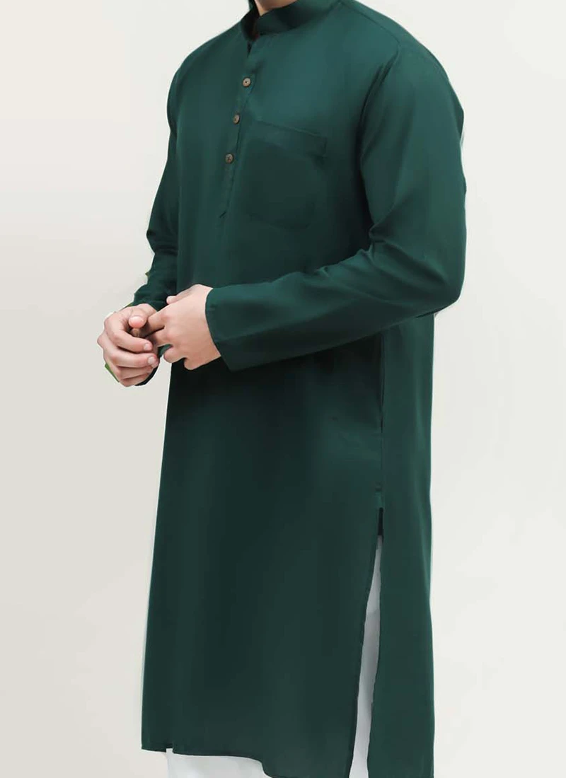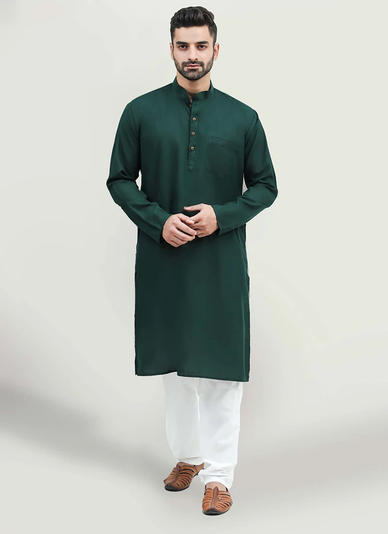 Paired with the kurta the pyjama completes the traditional look. The pyjama is designed for comfort and style with a relaxed fit that allows for easy movement. The elasticized waistband ensures a snug and adjustable fit catering to different body shapes and sizes. The matching dark green hue of the pyjama complements the kurta perfectly creating a harmonious and cohesive appearance.