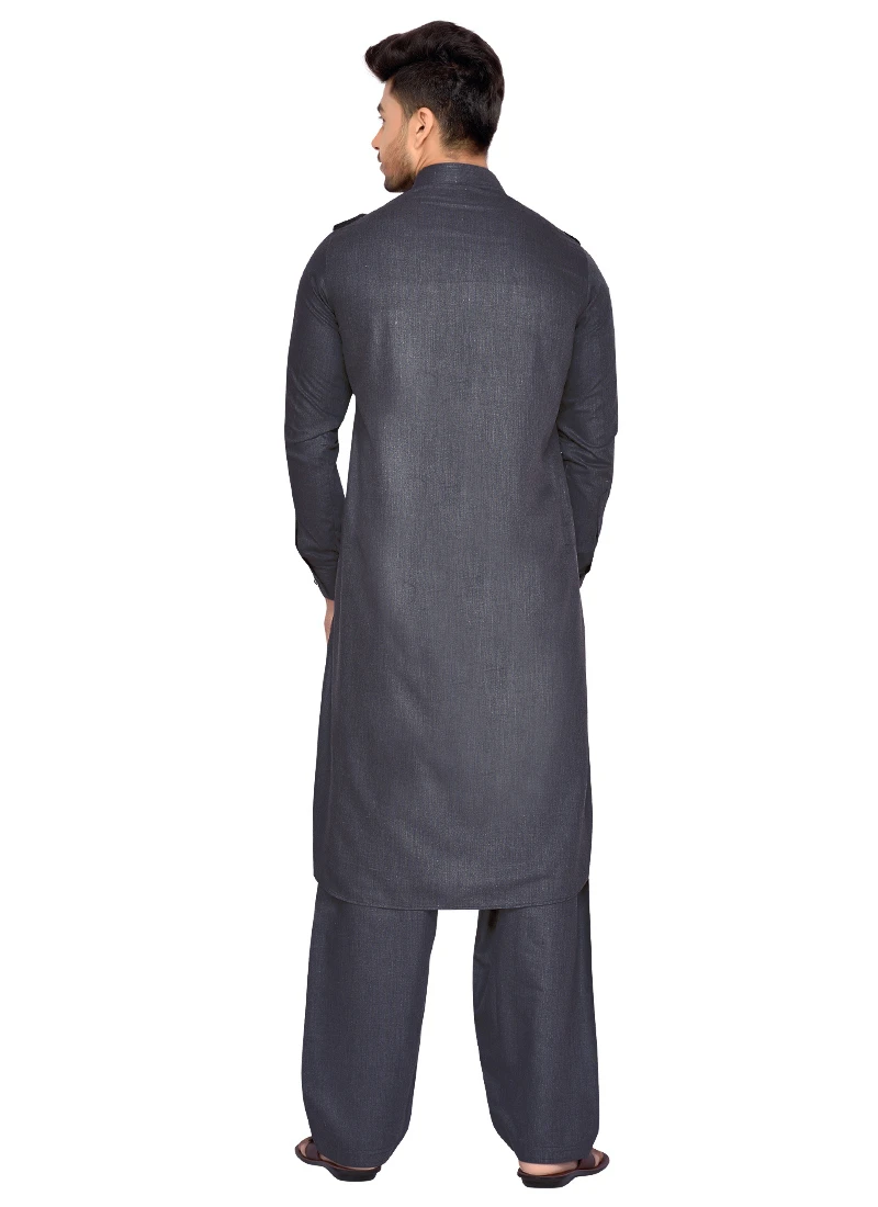 Dark grey art silk plain structred pathani set with side square pockets on it. Comes with matching bottom.