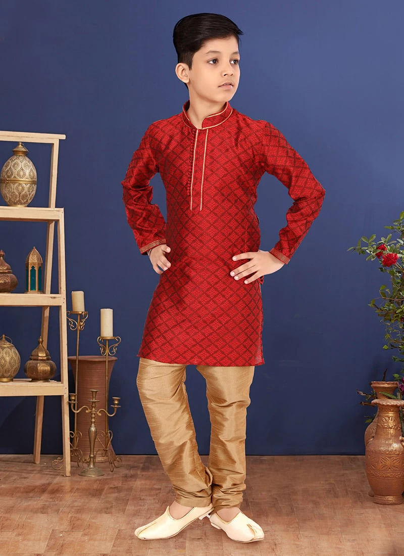 An remarkable dark red blackberry silk boys kurta pyjama enriched with jacquard work crafted with close collar neck and full sleeves is representing a royalty in itself. This kurta pyjama comes with gold dupion silk chudi pant bottom.