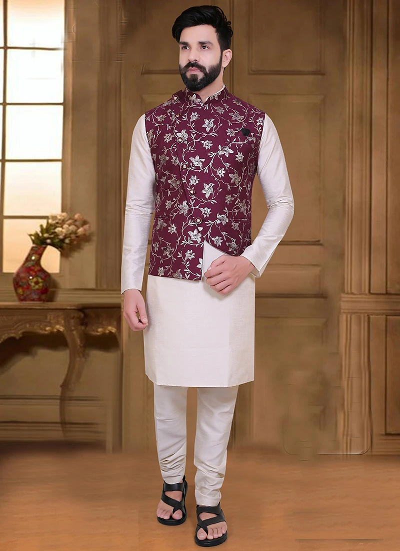 Magnificent deep wine velvet nehru jacket crafted with mandarin collar neck and sleeveless enriched with soild plain work is representing royalty in itself.