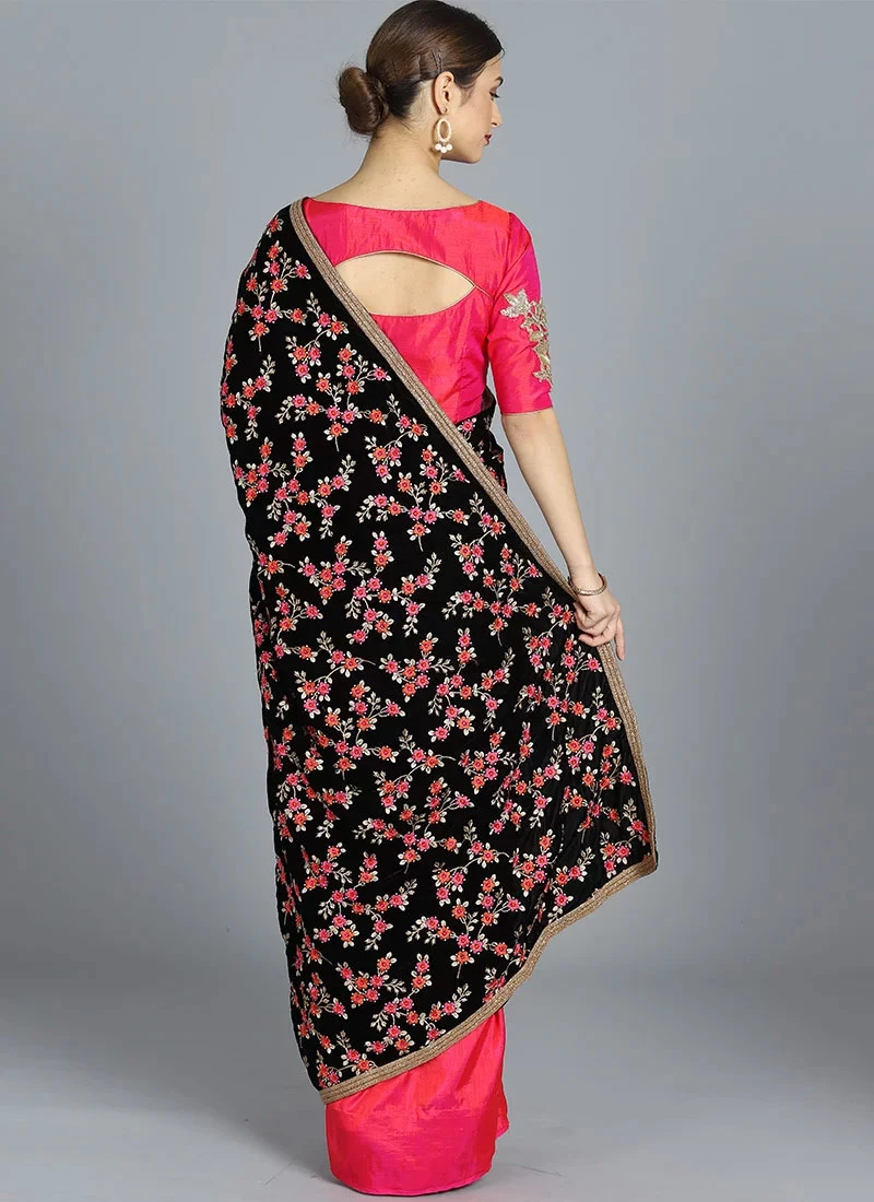 The pallu part is of embroidered black velvet fabric adorned with stunning lace is paired up with pink soft silk saree..