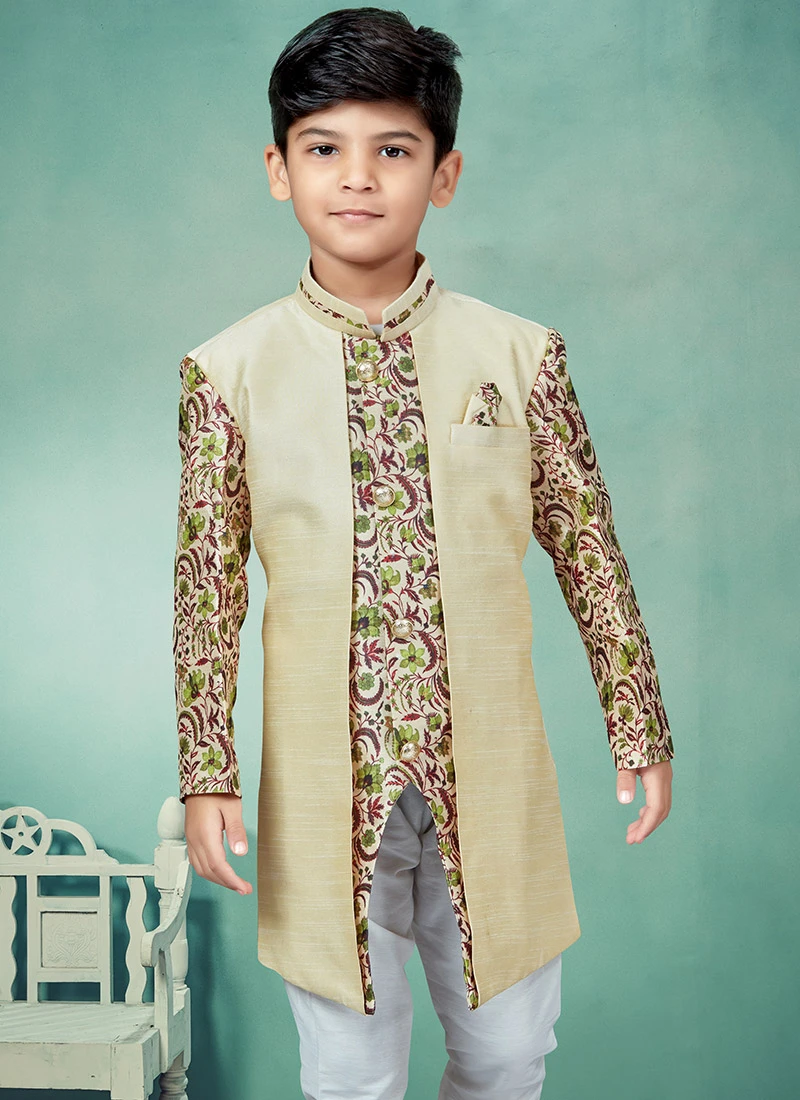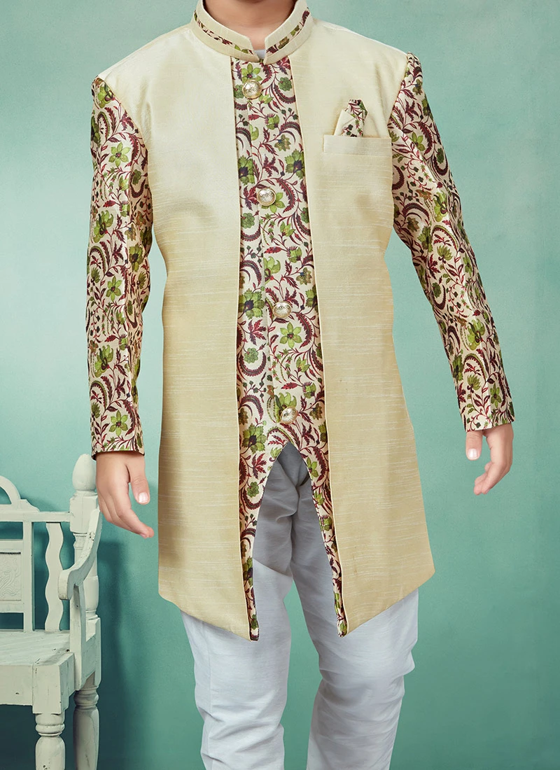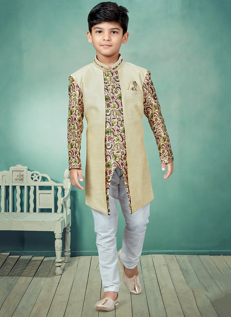 Your child looks pretty in this gold art silk boys indowestern sherwani enriched with printed work over the sherwani and jacket comes with gold with plain work looks chic and desirable. This sherwani comes with off white silk dupion chudi pant bottom.
