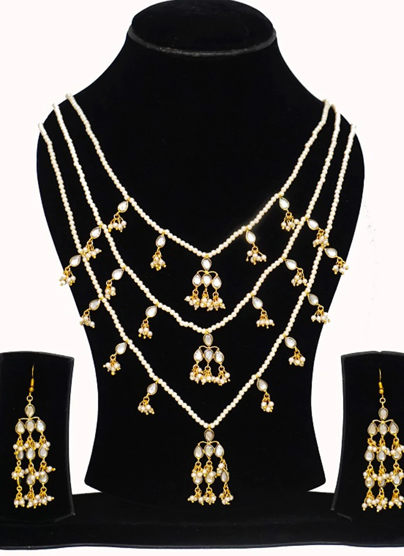 In summary the Alankar Kundan Layered Necklace Set is a masterpiece that captures the essence of Indian craftsmanship and sophistication. Its intricate design combined with the brilliance of Kundan stones and pearls creates a captivating aura of beauty and grace. This exquisite jewellery set is a testament to the rich cultural heritage of India and a symbol of timeless elegance.