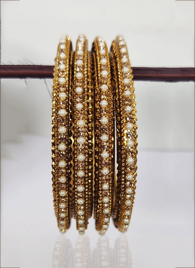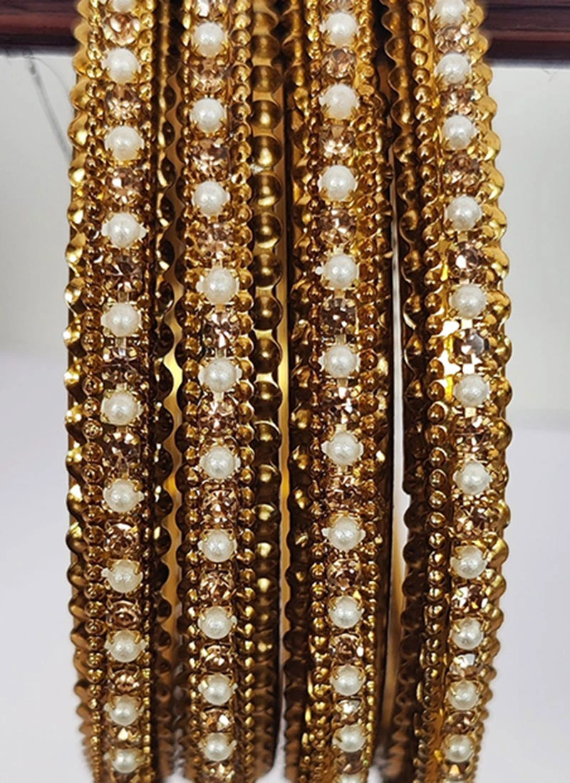 Design and trend will be at the peak of your magnificence after you wear this gold plated bangle set. This bangles beautifully designed with white beads work.