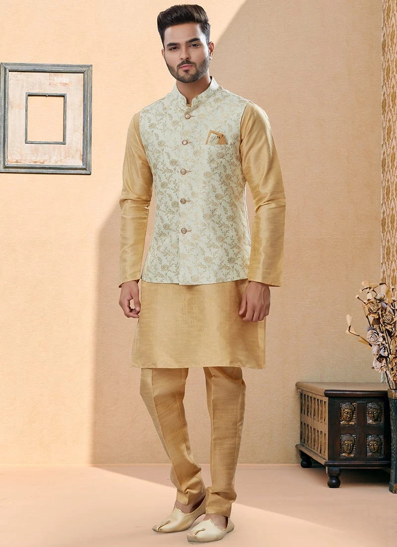 Look sensationally awesome with this gold silk dupion bandi set enriched with soild plain fabric crafted with full sleeves and mandarin collar neckstyle is representing a royalty in itself. This bandi set comes with gold silk dupion chudi pant bottom. The bandi set comes with cream banarasi jacquard nehru jacket.bandi set comes with cream banarasi jacquard nehru jacket.