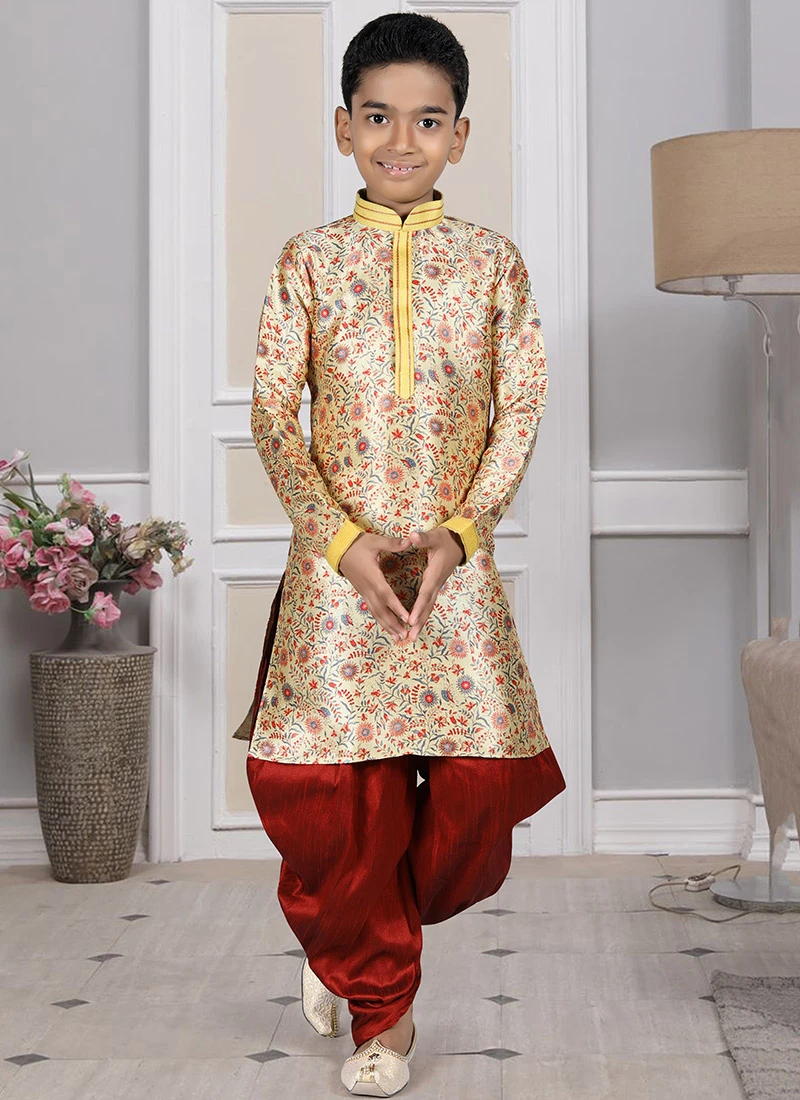 Your special days will trend up with this golden color art silk kurta pyjama enriched with printed work over the kurta and crafted with collar neck and full sleeves look desirable. Comes with maroon color art silk dhoti bottom.