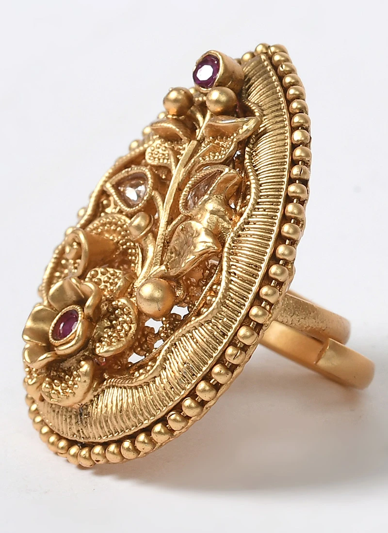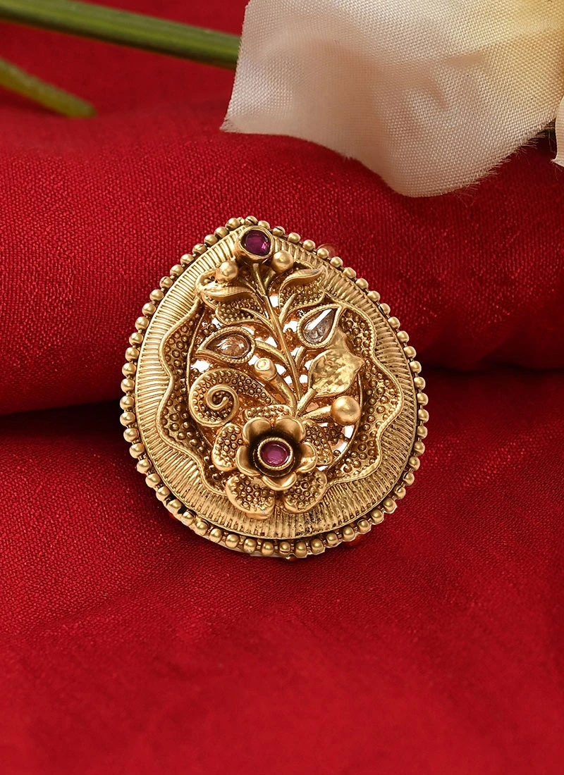 Surrounding the pearl is a meticulously crafted brass setting designed to enhance the pearls beauty while adding a touch of contemporary flair. The golden brass complements the pearls colour creating a harmonious combination that is both classic and modern. The setting is intricately detailed featuring delicate engravings and ornate patterns that add to the rings overall charm.