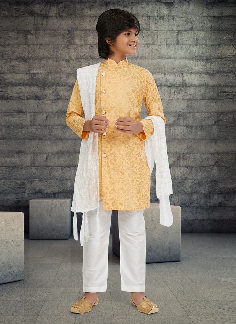 Fashion and pattern could be at the peak with this golden cotton kids boys indowestern sherwani enriched with some incredible designs over the sherwani and crafted with full sleeves and mandarin collar neckstyle is representing a royalty in itself. This sherwani comes with off white art silk pant bottom.