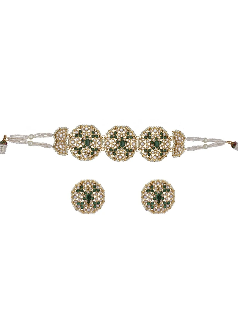 Elevate your style with our Green Alloy Moti Choker a statement piece that blends timeless elegance with contemporary flair. This exquisite choker adorned with enchanting green moti pearls is designed to captivate attention and add a touch of sophistication to your look. Crafted from highquality alloy our Green Alloy Moti Choker is a testament to durability and comfort. Its lightweight design ensures you can wear it effortlessly from day to night.This choker showcases a captivating arrangement of green moti creating a classic yet trendy aesthetic. The pearls natural luster adds a touch of opulence to your ensemble making it suitable for various occasions. Featuring an adjustable chain this choker can be tailored to fit your neck comfortably. Whether you prefer a snug fit or a more relaxed style this necklace adapts effortlessly to your preferences.The timeless design of this choker makes it versatile enough to complement a wide range of outfits and occasions. Whether youre dressing up for a formal event or adding a touch of charm to your everyday attire this piece effortlessly enhances your style.Elevate your evening look by pairing the Green Alloy Moti Choker with a classic black dress creating an enchanting contrast that draws attention to your neckline.Add a touch of sophistication to your daily wear by wearing it with a simple white blouse and jeans.Gift this choker to someone special a symbol of your appreciation for their unique style and elegance.we take pride in curating exceptional jewellery that seamlessly merges tradition and modernity. Our Green Alloy Moti Choker embodies our commitment to offering you highquality exquisitely designed pieces that enhance your style and reflect your unique personality.Choosing this choker means more than acquiring jewelry its investing in an accessory that mirrors your individuality and adds a touch of elegance to every occasion. Elevate your fashion game with the Green Alloy Moti Choker and experience the joy of wearing exquisite craftsmanship. Order yours today and embrace the perfect fusion of timeless elegance and contemporary style.