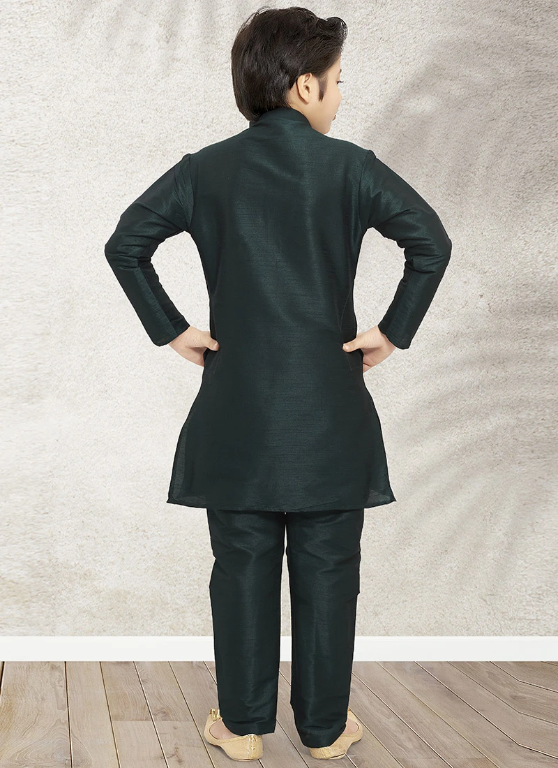 An remarkable green art banarasi silk boys bandiset will make you stylish and graceful. It plain work crafted with full sleeves and collar neckstyle looks chic and ideal for any affair. This set comes with green art banarasi silk chudi bottom and with printed work nehru jacket.