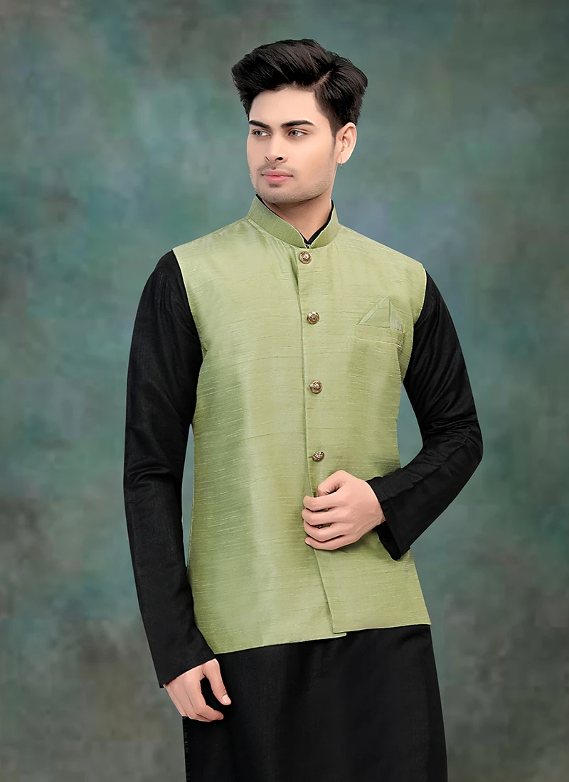 Be your own style icon in this green art silk nehru jacket crafted with mandarin collar neck and sleeveless enriched with plain work is representing royalty in itself.