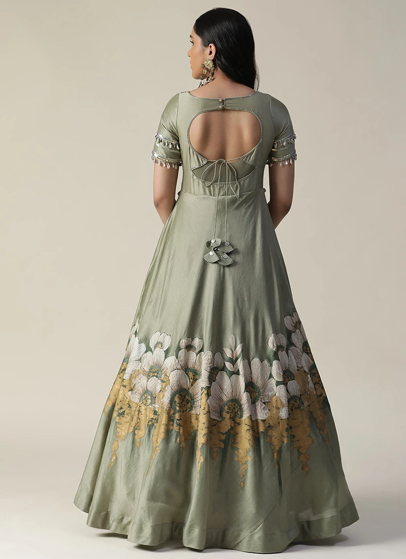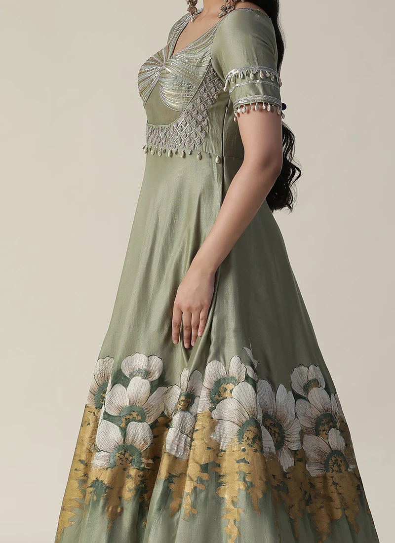 The gown in a soothing shade of pista green is adorned with intricate handpainted flower motifs each stroke reflecting the artisans dedication to perfection. These delicate paintings are complemented by opulent golden thread embroidery adding a touch of regal splendour to the gown. The play of light is enhanced by the subtle addition of sequins which glimmer like stars in the night sky creating a mesmerizing effect that is sure to turn heads.